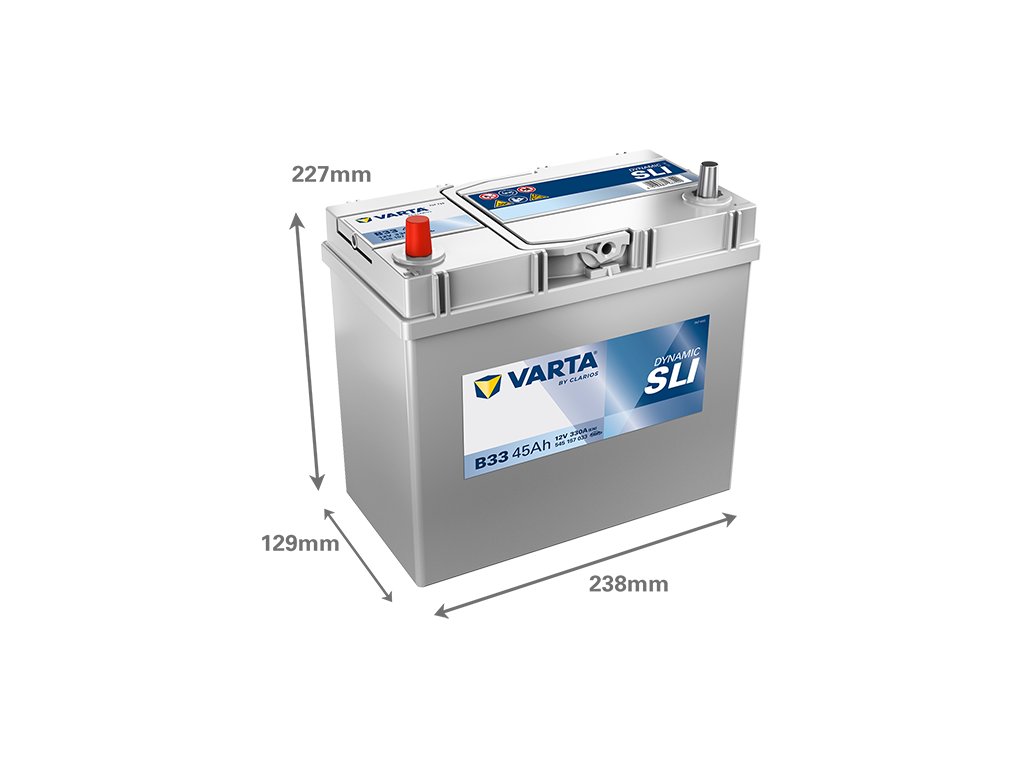 Autobaterie Varta Blue Dynamic 45Ah.Hlavní parametry: kapacita 45Ah, startovací proud 330A, rozměr: délka 238 mm, šířka 129 mm, výška 227 mm, hmotnost: 11,68 kg, +pól vlevo.